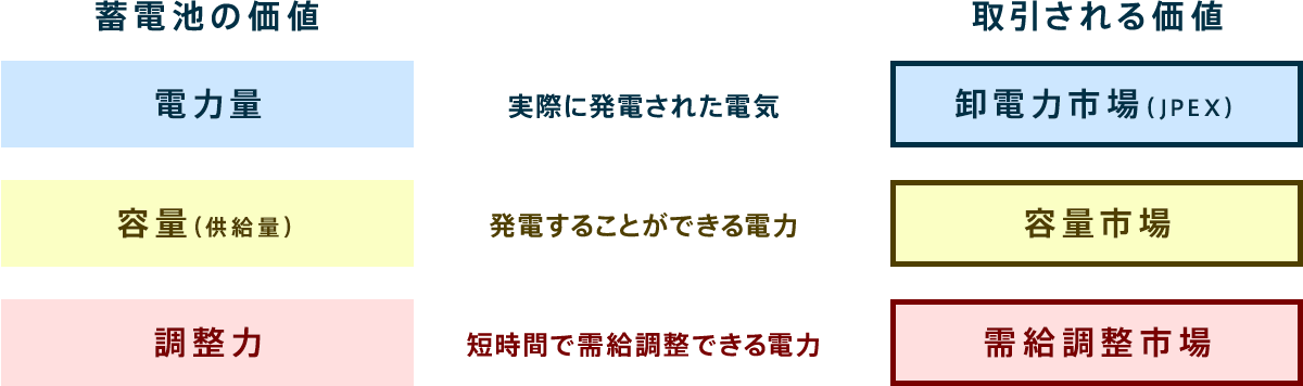 蓄電池はこの市場で非常に有効で、必要なときに放電したり、余剰電力を吸収することで、調整役として報酬を得ることができます。